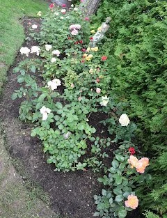 A sampling of my Hybrid Tea Rose Garden with Goddess Rose in the background as overseer of the roses.